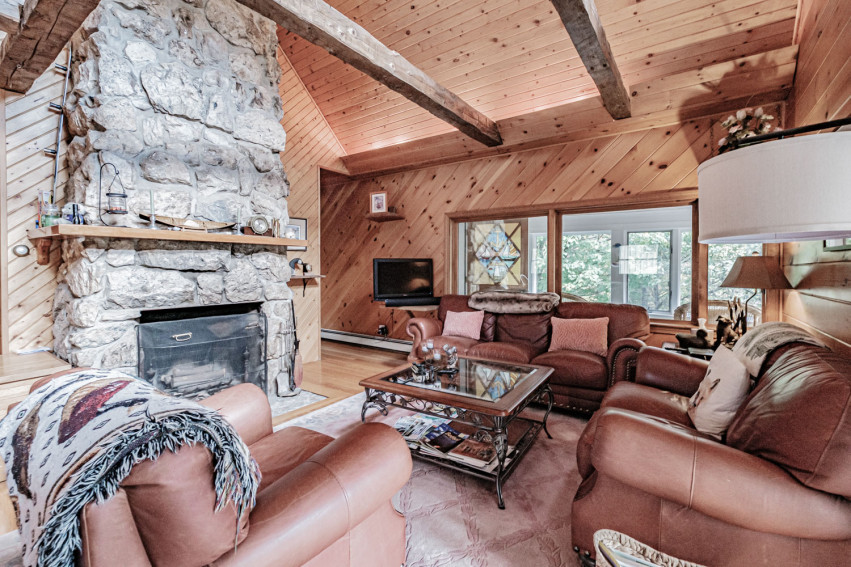 With soaring ceilings, a two-story rock-faced fireplace and exposed wooden beams, it's hard to imagine spending your days anywhere but here.
